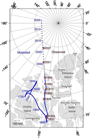On June 1, 1831, James Clark Ross found the north magnetic pole just off the eastern coast of the Boothia Peninsula, in the Canadian Arctic. I could give you the coordinates, but it’s not there anymore. In fact, it’s not even close.