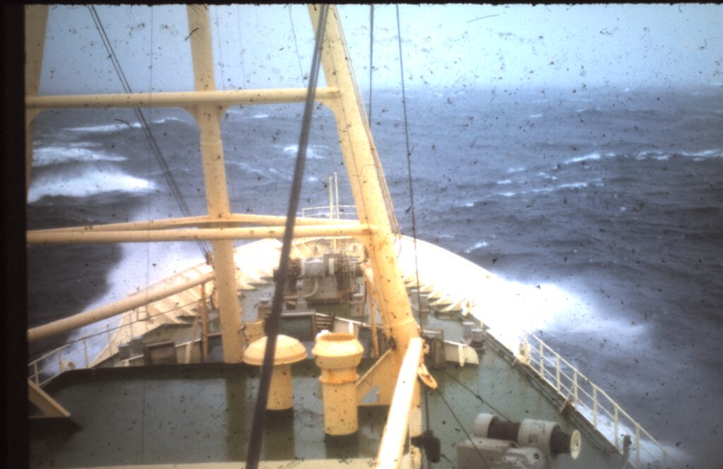 …was this the end of our journey?? The crew on the bridge told us to go inside and close all doors and portholes! Our vessel Broland was at still, not going anywhere. Our captain informed us that we were in a ”dead zone” and no radio connection could be made neither the compass or navigation system was in function…..we did not know which way to get out of this HELL !!…..A drastic decision on the bridge was made to go at full speed ahead against the dark wall of shriving clouds and rain. The decision was taken by our captain. Very soon we left this calm dark sea behind us and met huge waves and even stronger winds….we were rolling and jumping again and without sight ahead more than the length of the ship. I had never experienced this before, we seemed to be lost and going nowhere. Suddenly after long hours of living hell, the sky opened, and we had left the center of the hurricane behind us.